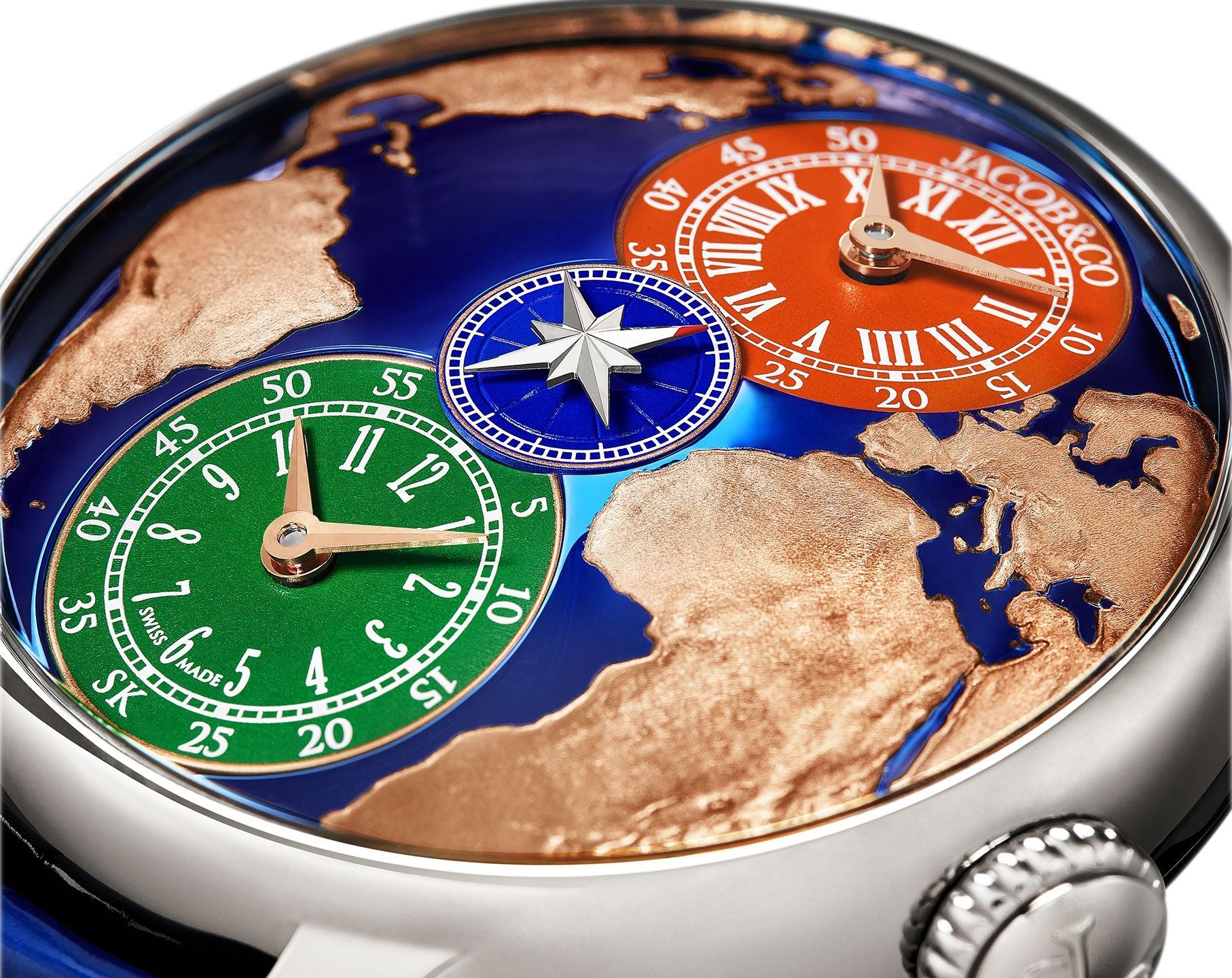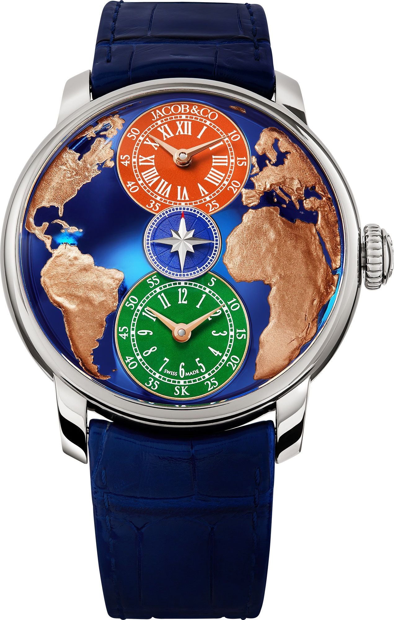The Jacob & Co. Self-Winding JCAA14 is a finely engineered automatic movement, showcasing 206 meticulously assembled components and 33 jewels for optimal precision and durability. Operating at a frequency of 28,800 vibrations per hour (4 Hz), it delivers smooth and reliable performance. A standout feature of the JCAA14 is its double timezone function, allowing independent adjustment of both hours and minutes, a testament to Jacob & Co.’s commitment to functional complexity. Additionally, a central small seconds mechanism enhances timekeeping precision. With a 42-hour power reserve, this movement maintains stable operation, ensuring longevity and efficiency. The JCAA14 exemplifies Jacob & Co.’s expertise in crafting high-performance calibres, blending innovation with mechanical mastery.